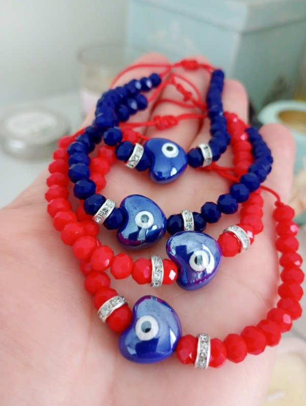 Pulsera de hilo chino, cristales de roca, corazón de cerámica y donas con Strass.