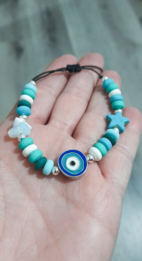 Pulsera o tobillera, con hilo chino, fimos, ojo de metal, piedras naturales.
