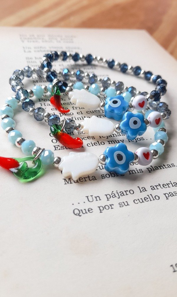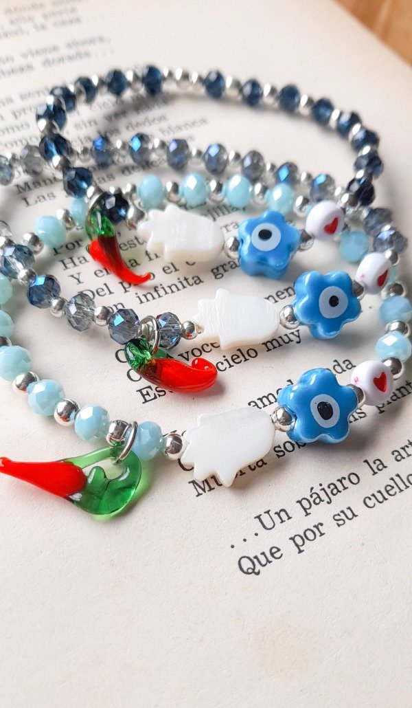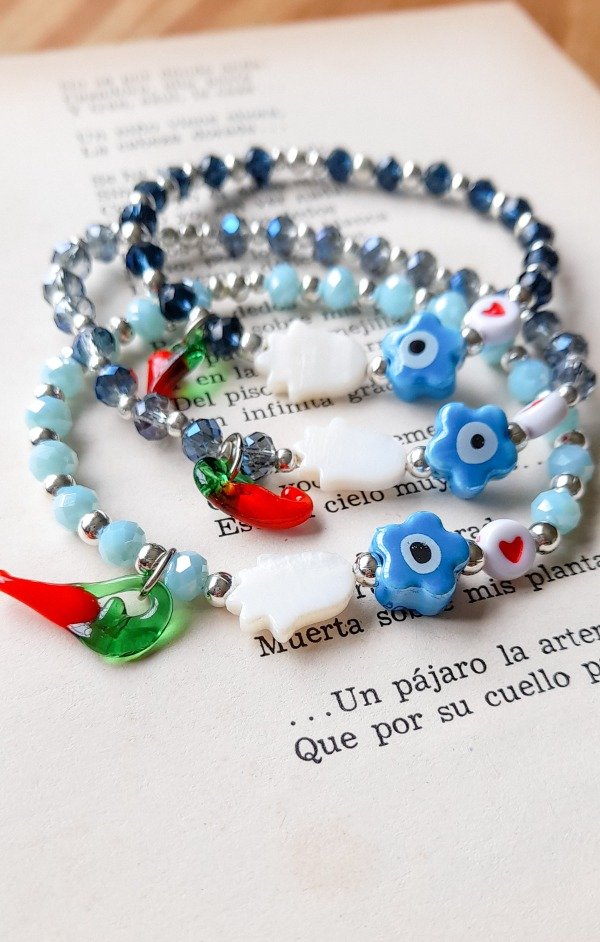 Pulsera elástica de cristales, con dijes de nácar, cerámica y muramos y bolitas de fundición. Super protectora y hermosa.
