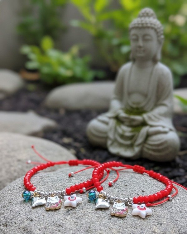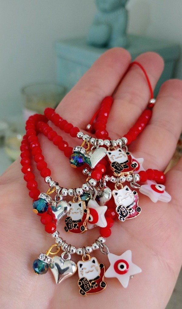 Pulsera de hilo chino, cristales de roca, dijes esmaltados, de nácar y de metal.