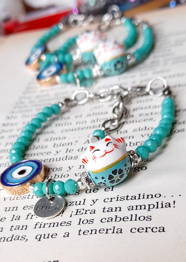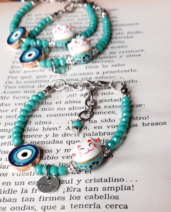 Pulser de cristales de roca, dijes de ceramica y metal. Tanza de acero. Con cadena de alargue.