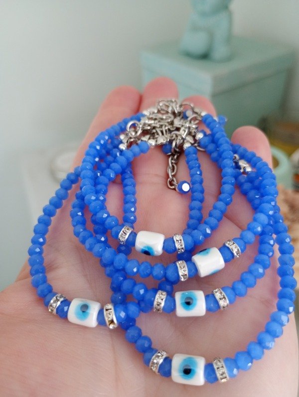 Cristales con dije de ceramica, donas de Strass y Tanza de acero.