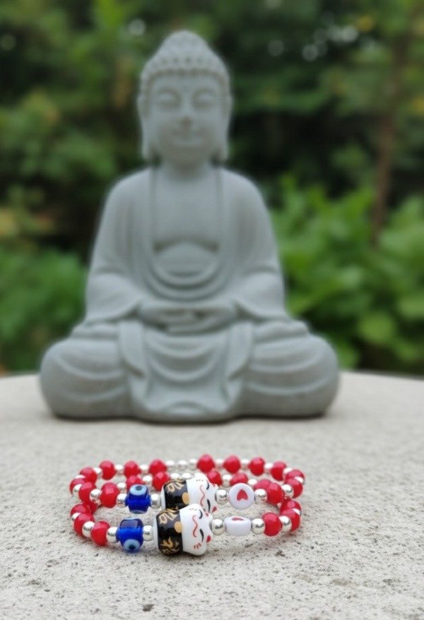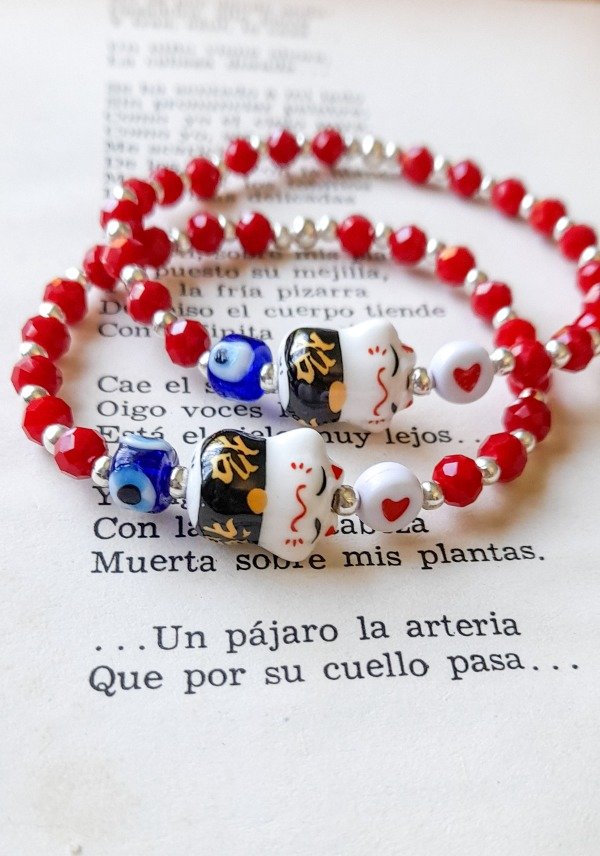 Pulsera elástica con cristales de roca, bolitas de fundición y dijes de cerámica y muranos. Para usarla todos los día y estar protegida y linda.